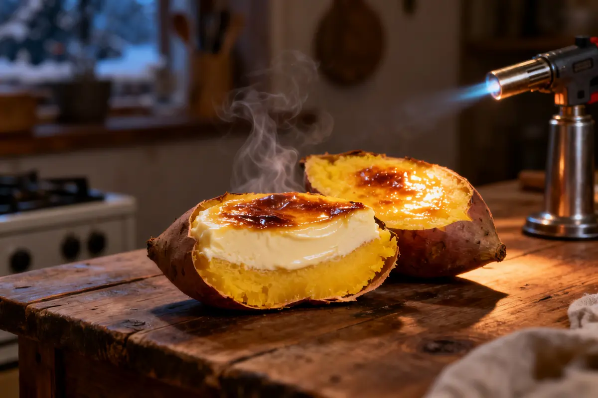 Servez immédiatement. C’est le contraste des températures qui crée la magie : la patate douce reste tiède, la crème demeure fraîche, et la croûte caramélisée ajoute ce craquant irrésistible.