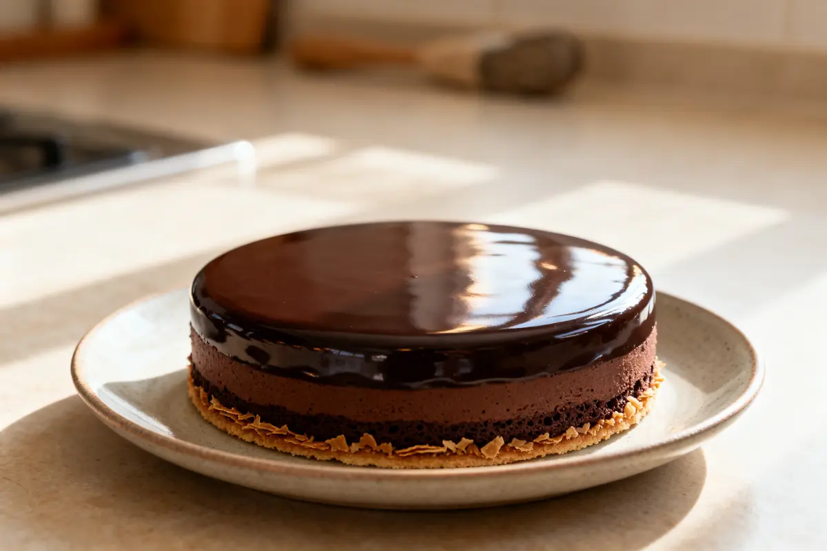 Le glaçage miroir apporte cette finition si élégante. Portez à ébullition 75 g de crème liquide puis versez‑la en trois fois sur 150 g de chocolat noir haché. Mélangez jusqu’à obtenir une texture lisse. Incorporez ensuite 50 g de beurre en petits dés et mixez au mixeur plongeant sans créer de bulles d’air. La température idéale d’application est de 35 °C.